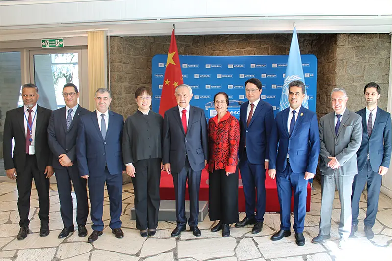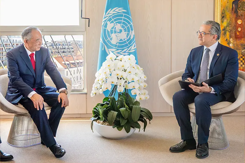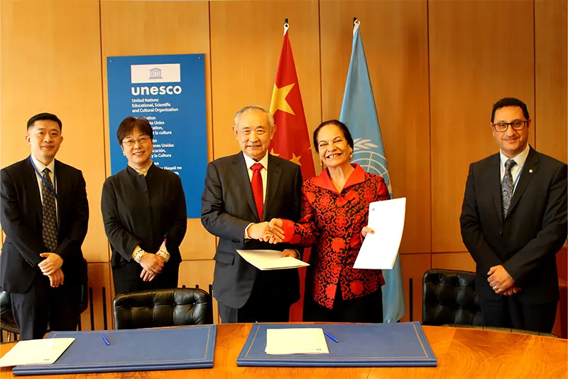 李若弘主席还与联合国教科文助理总干事莉迪亚阁下签署了全球青少年短视频大赛合作协议。今年是中非犮好年,在与总干事、助理总干会谈后,还与教科文主管非洲优先的助理总干事Elfarnawany 先生探讨了和平、文明、发展主题下的中非友好合作。